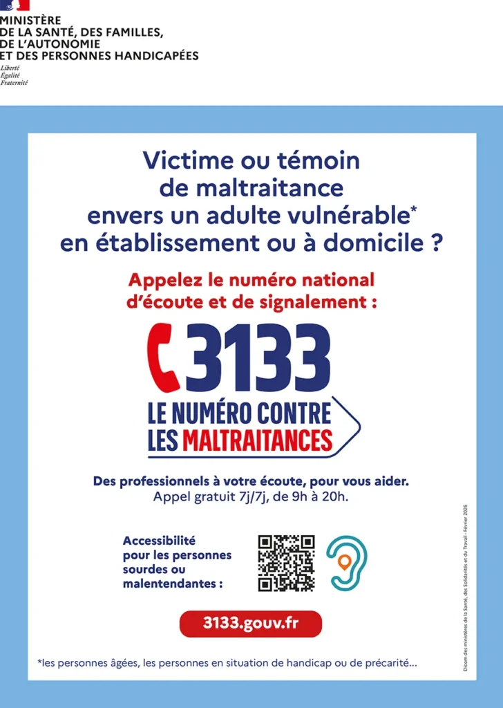 À compter du 1er mars 2026, de la nouvelle plateforme téléphonique nationale 3133, dédiée au recueil des signalements de situations de maltraitance concernant les adultes vulnérables. Cette plateforme s’inscrit dans le renforcement du dispositif national de prévention et de lutte contre les maltraitances.